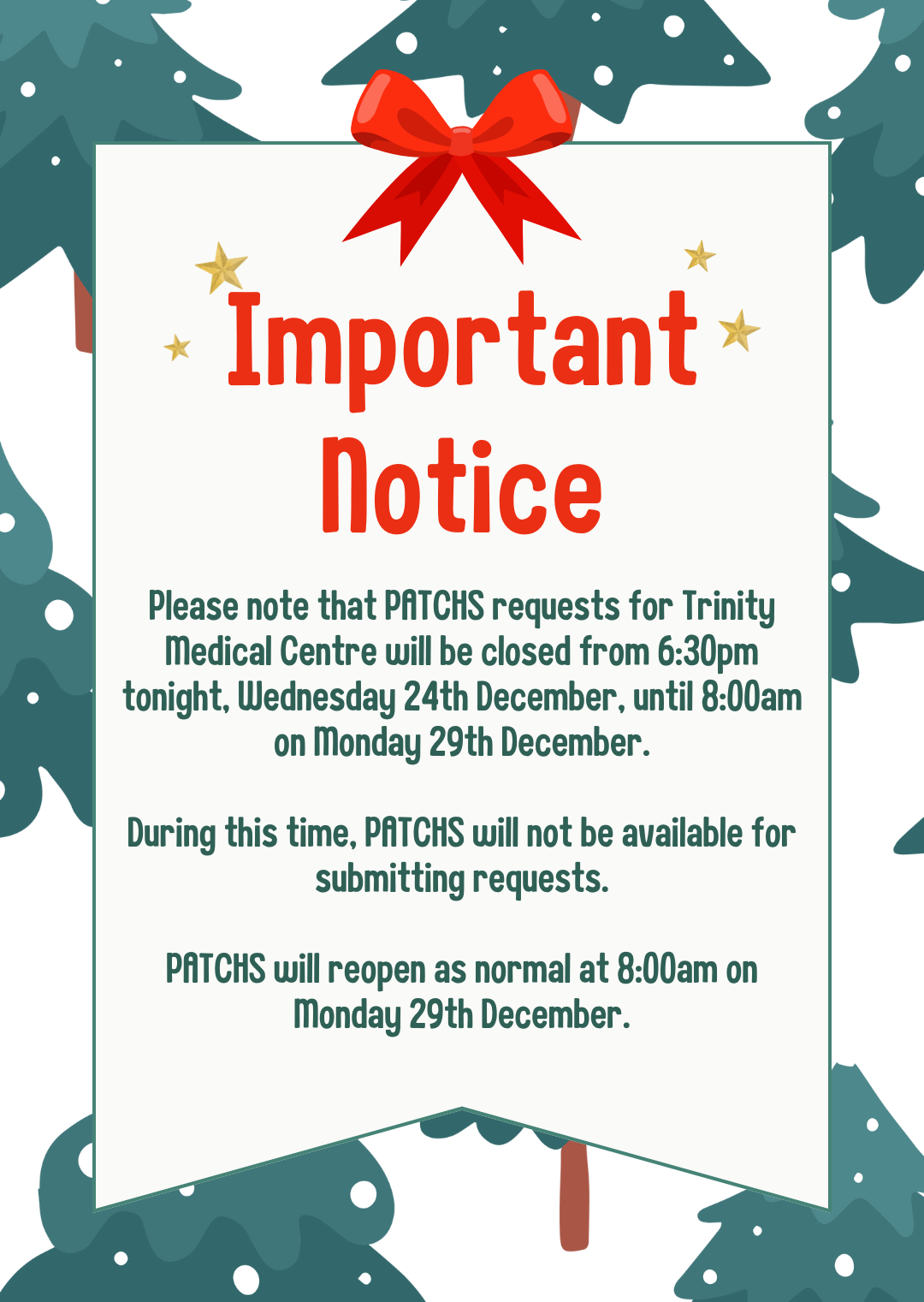 Please note that PATCHS requests for Trinity Medical Centre will be closed from 6:30pm tonight, Wednesday 24th December, until 8:00am on Monday 29th December.